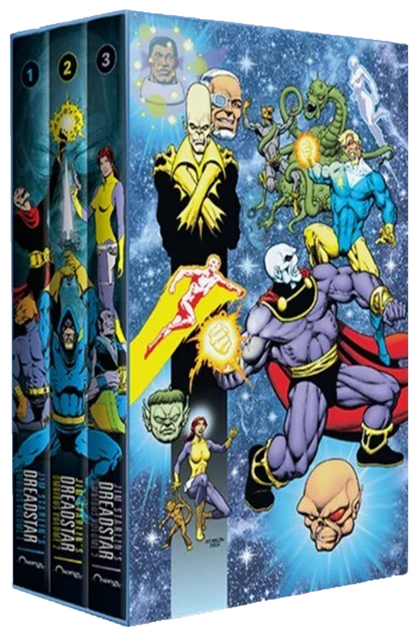 The Dreadstar Slipcase Set collects the complete cosmic epic from legendary creator Jim Starlin, presenting his landmark sci-fi saga in definitive form. This premium set includes Dreadstar Omnibus Volumes 1, 2, and 3, totaling over 1,500 pages of sweeping cosmic adventure, philosophical storytelling, and iconic characters. Completely remastered by Jim Starlin himself, the collection also features exclusive and rare bonus material in each volume. Housed in a limited-edition slipcase with brand-new Starlin artwork, this set is an essential centerpiece for fans of cosmic comics and serious collectors alike.